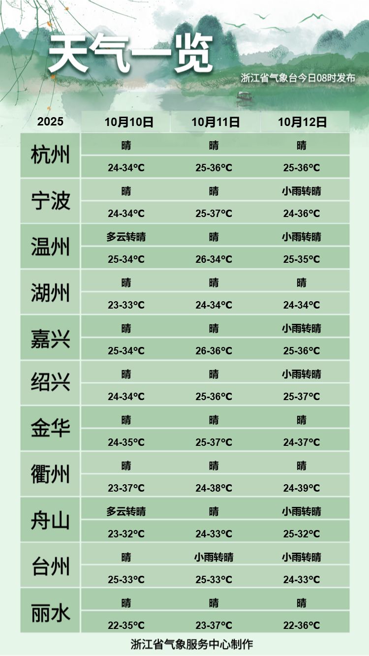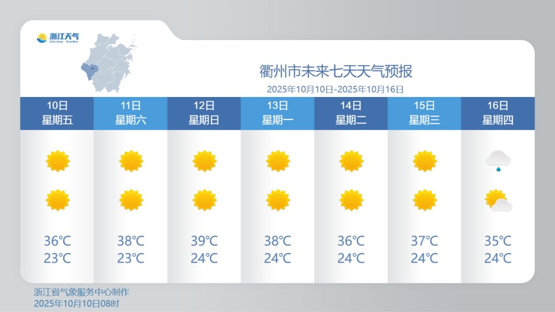 未来七天浙江仍有异常高温天气,金衢丽地区高温日数5~6天,其他大部4天左右,午间户外气温较高、紫外线强,外出需注意防暑防晒。另外,14日起浙江有分散性阵雨或雷雨,请大家关注最新预报预警信息。