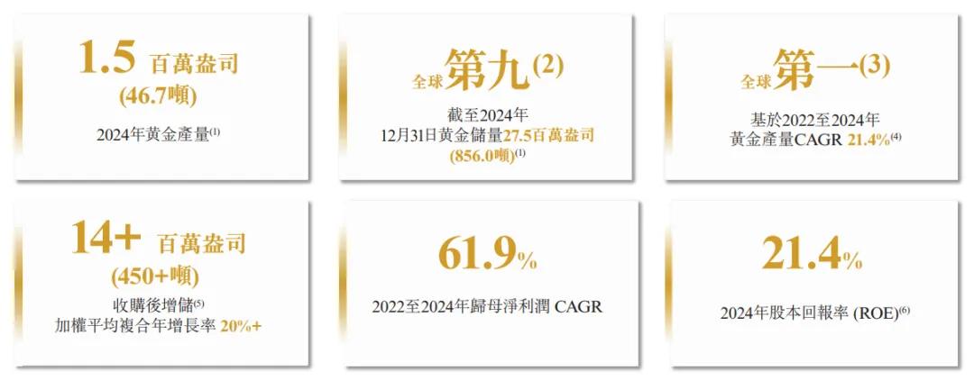 根据弗若斯特沙利文的资料,紫金黄金国际截至2024年12月31日的黄金储量和2024年的黄金产量分别位居全球第九和第十一。2022年至2024年黄金产量的复合年增长率达到21.4%,母公司拥有人应占净利润的复合年增长率为61.9%。