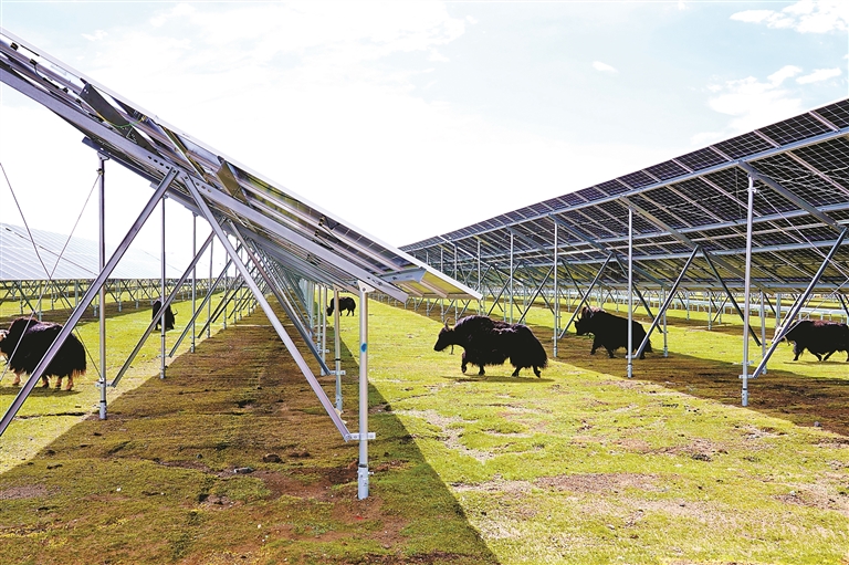 在华电罗布沙光伏项目区,整齐的光伏板阵列与圣洁的雪山共同构成独特景致。光伏板下,回铺的草甸悄然复苏,牦牛悠然其间觅食,形成独特的“牧光互补”模式,实现了生态保护与清洁能源生产的双赢。